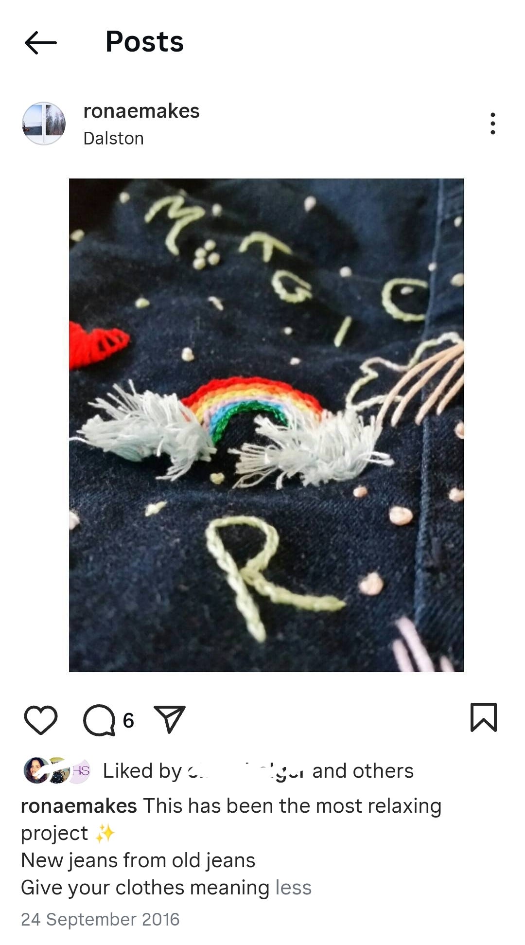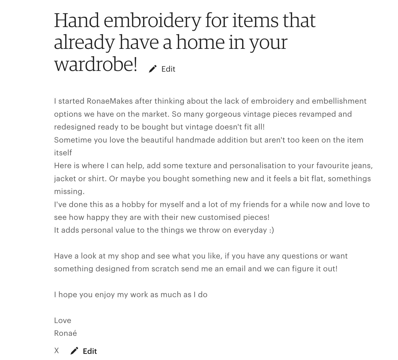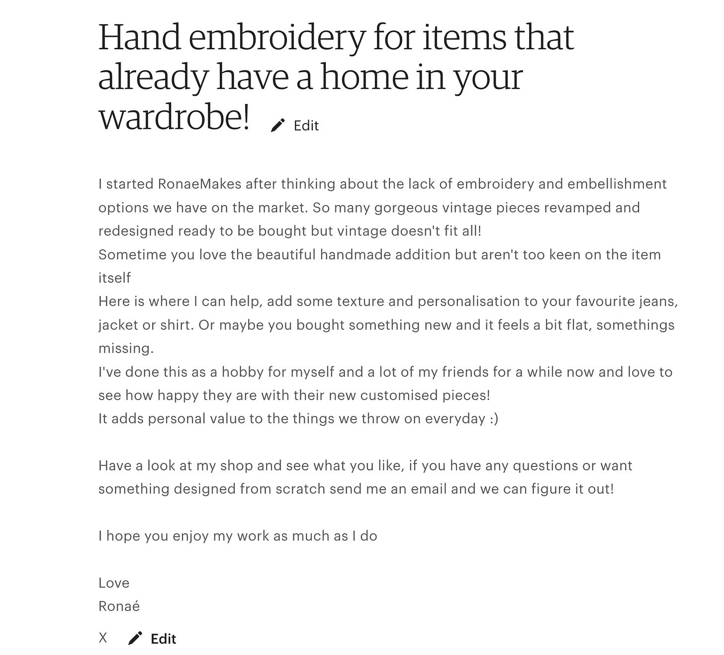 In 2016 I had the idea to open my own Etsy shop to offer a custom hand embroidery service for worn out clothes “Ronaé Makes”.